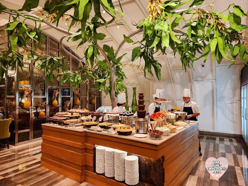 Now, onto the star attraction for those with a sweet soul: the dessert station. Honestly, it felt more like an exhibit than a buffet corner. Suspended above the entire section was a dreamy art installation of Ilang-Ilang leaf patterns—curved, floating, and softly lit—mimicking a cloud that hovered over trays of cakes, pastries, and traditional sweets. It was like entering a soft, sacred space curated to delight both eyes and taste buds.